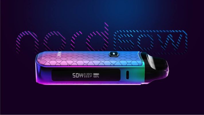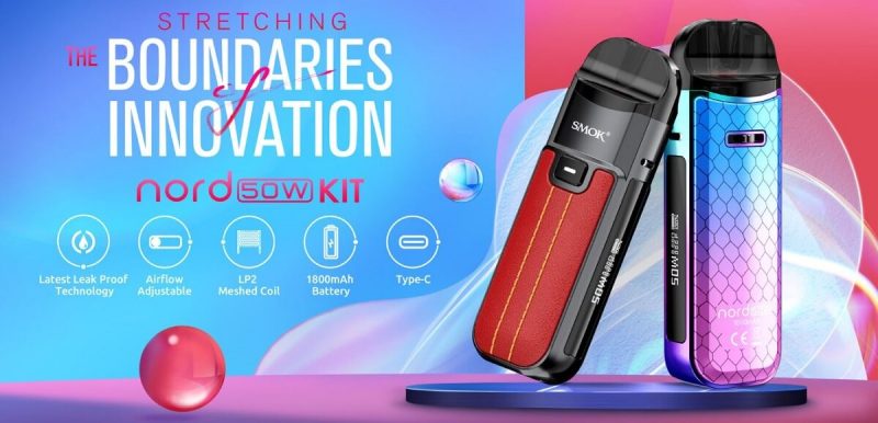 Nord 50W by Smok featuring a 5-50W output range, integrated 1800mAh rechargeable battery, and an adjustable airflow control ring.