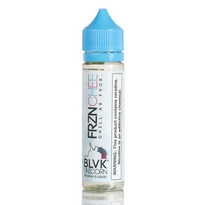 FRZNCHEE vape juice from BLVK Unicorn comes in a 60ml unicorn bottle. Its 70/30 VG/PG base allows for good vape cloud production and a solid throat hit.