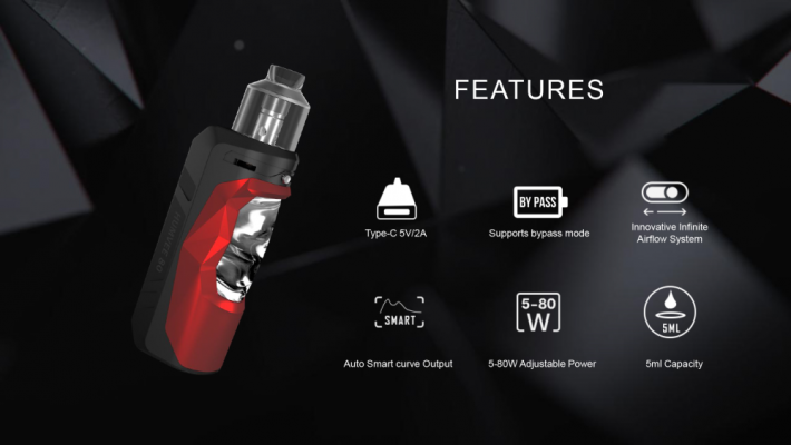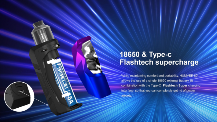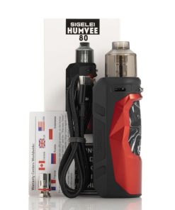 Sigelei HUMVEE 80 W Starter Kit Kit, powered by single 18650 battery, 5-80W range, and bottom filled 5mL pod capacity with press fit coils.