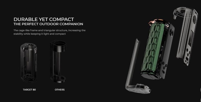 Target 80 by Vaporesso featuring an integrated 3000mAh battery, 5-80W output range, and is paired with the GTX PodTank 26.