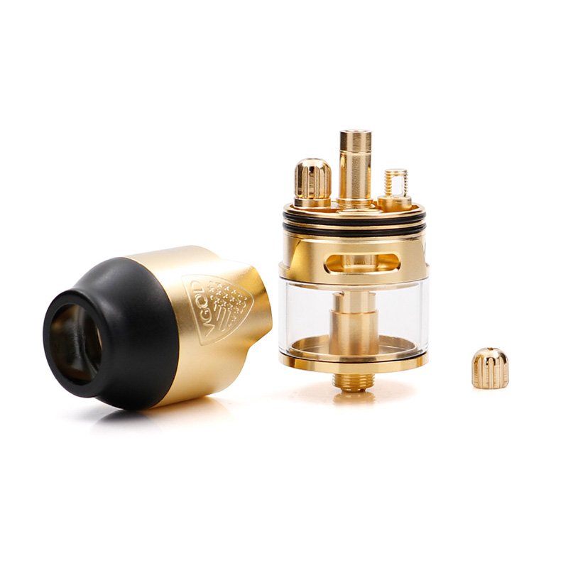 The VGOD ELITE RDTA presents a cloud-chasing achievement in a rebuildable dripping tank system, featuring a performance-ready structure with a unique two-post build deck design, vacuum wicking system, and bottom airflow delivery. The structure of the ELITE RDTA measures 24mm in diameter with high-quality construction, precisely executed with streamlined design and CNC engravings. The maximum juice capacity measures 4 milliliters, refilled via center fill port located inside the top cap. The two-post build deck is highly intuitive, presenting a user-friendly way to mount and secure wires. Coil leads are inserted into the two terminals, which are tightened with the knurled cap, clamping the coil in a consistent and secure manner (similar to Clamp Snag System). The result provides superior conductivity and a unique mounting experience, capable of maneuvering with Phillips or flathead screwdriver. Airflow was created with the intention of providing unsurpassed vapor and flavor, with air channels entering the two large exterior airlots and redirected up into the chamber section.