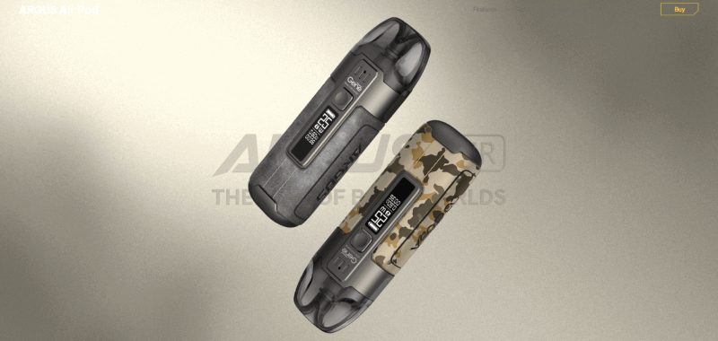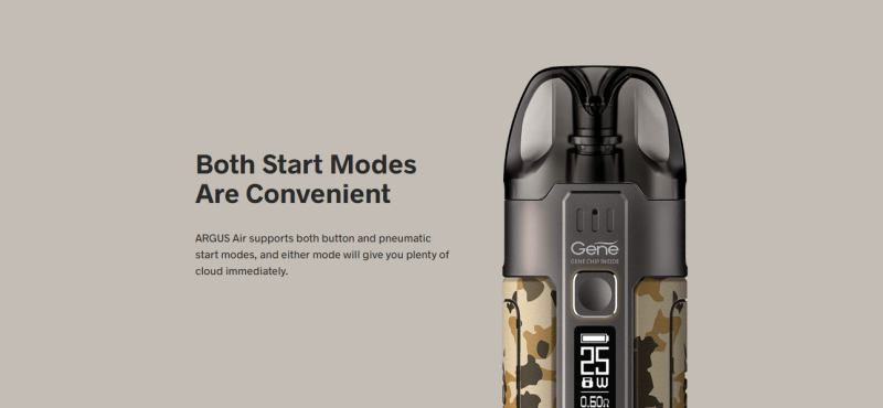 VOOPOO Argus Air 25W featuring a 900mAh battery, two different pod options and airflow, and has selectable dual firing mechanisms. Pair this with premium vape juice.