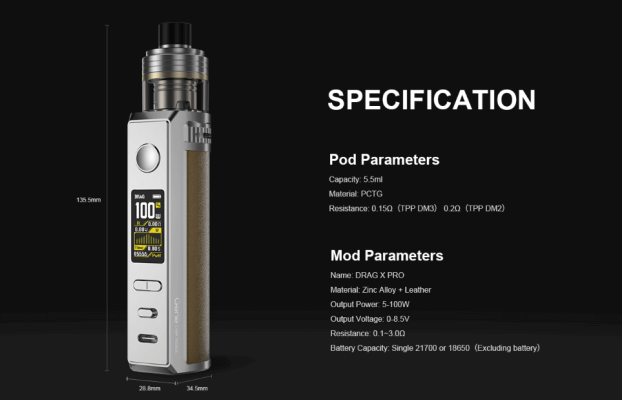 VOOPOO Drag X Pro 100W featuring a 5-100W output range, paired with the TPP-X Pod, and uses a single 18650 high amp battery (Sold separately).